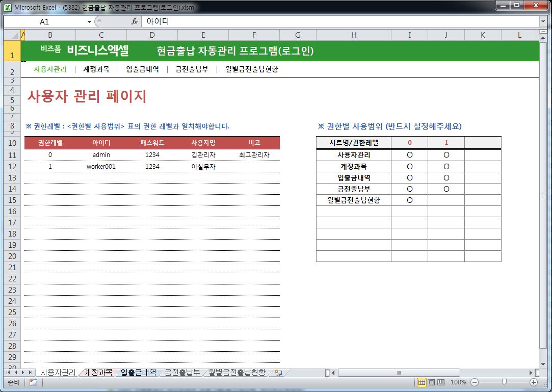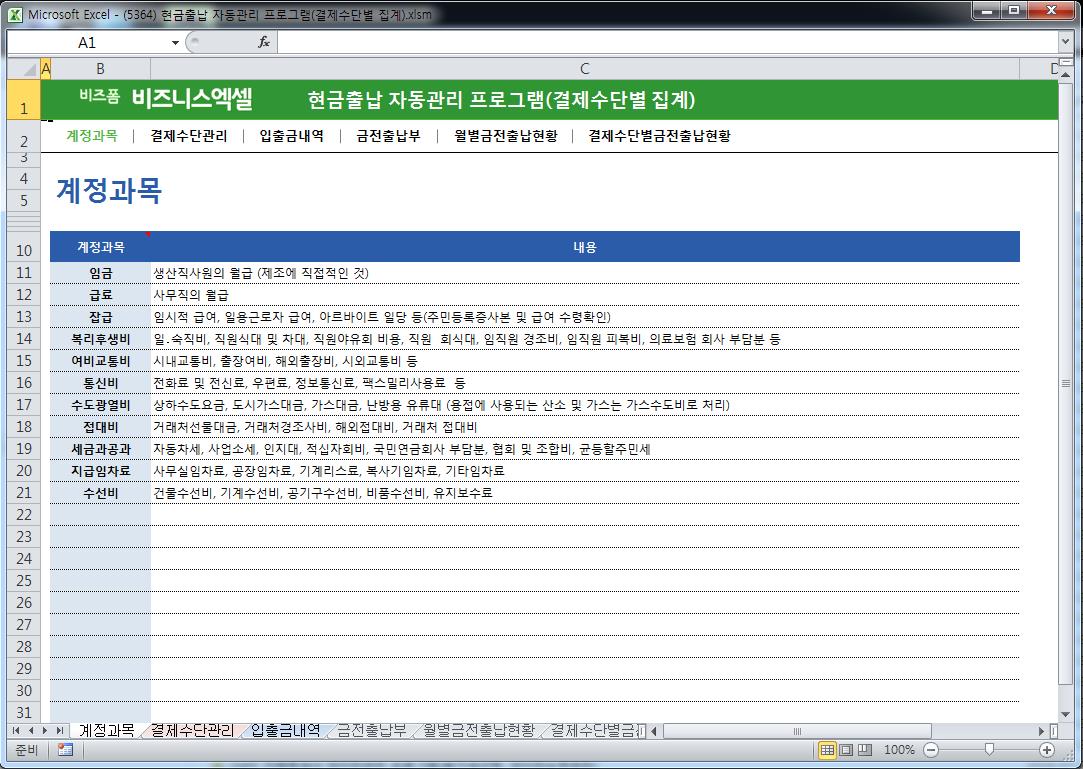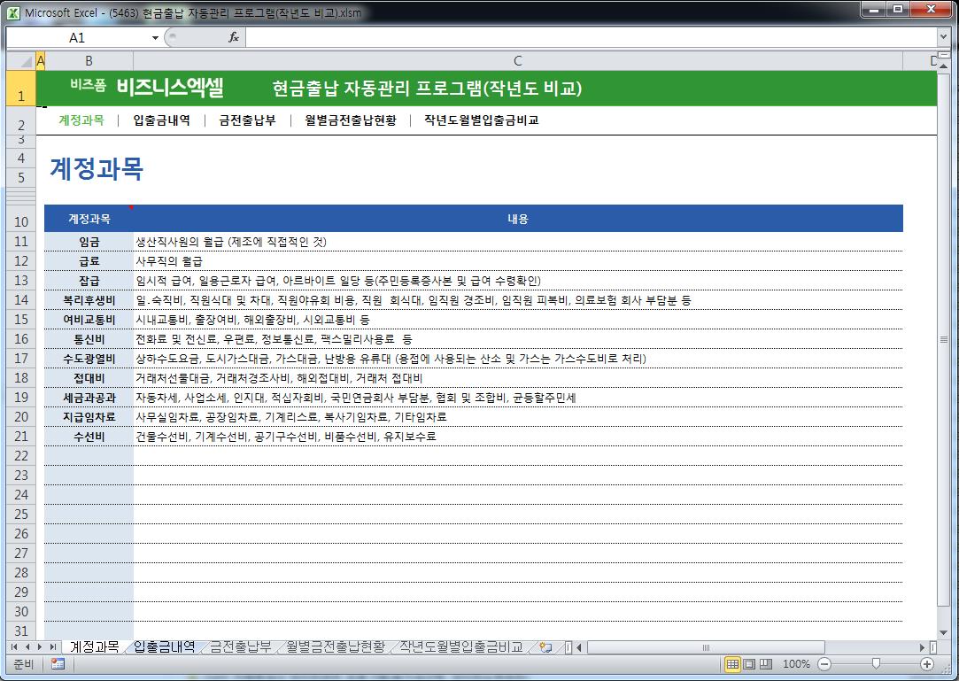 현금출납 자동관리 프로그램(계정과목별, 연별, 월별, 일별 금전출납 관리)